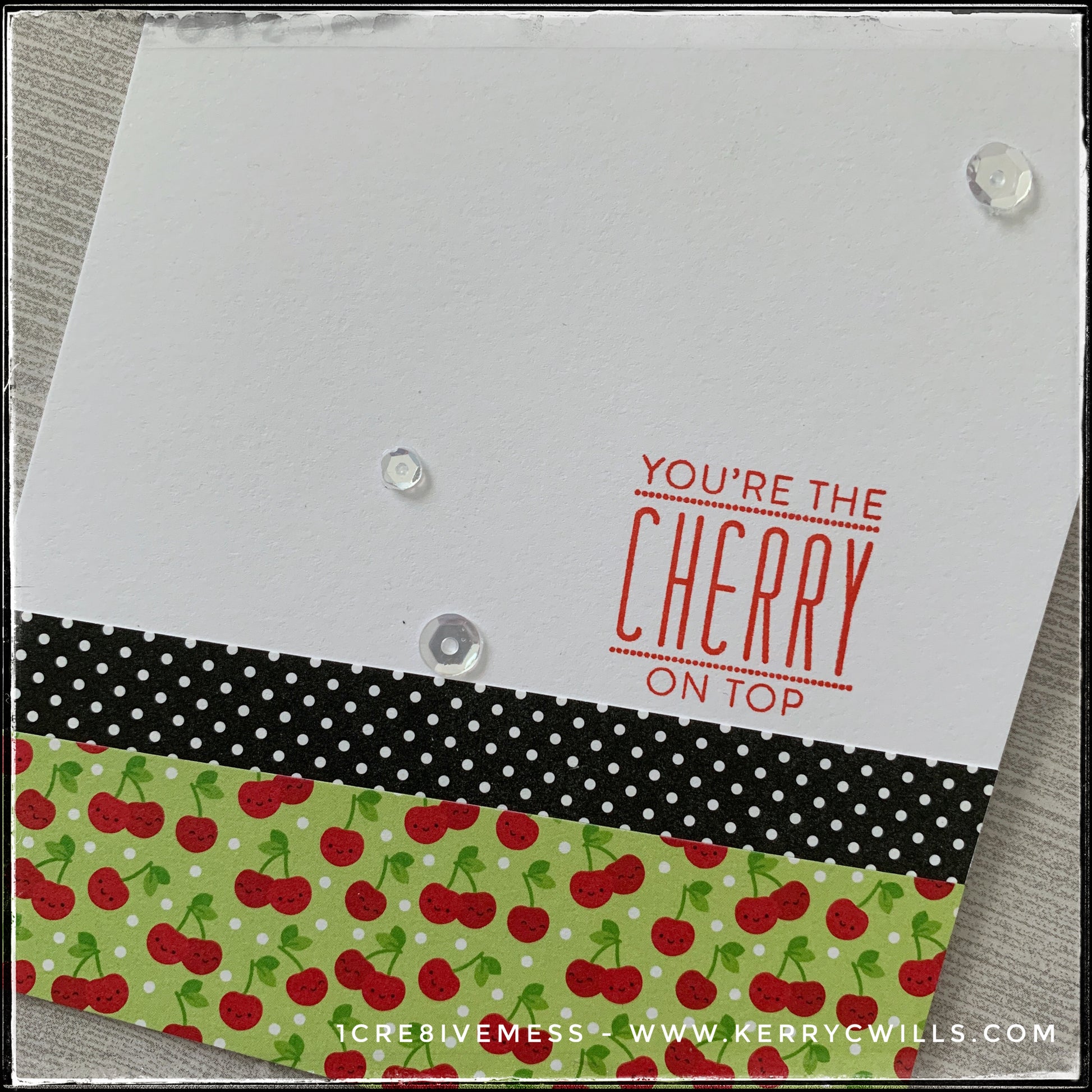 A sweet compliment [You're The Cherry On Top] is accented by a bold strip of black and white polka dotted paper, directly above a diagonal block featuring happy smiling bunches of cherries. A smattering of clear sequins adds some bonus detail.